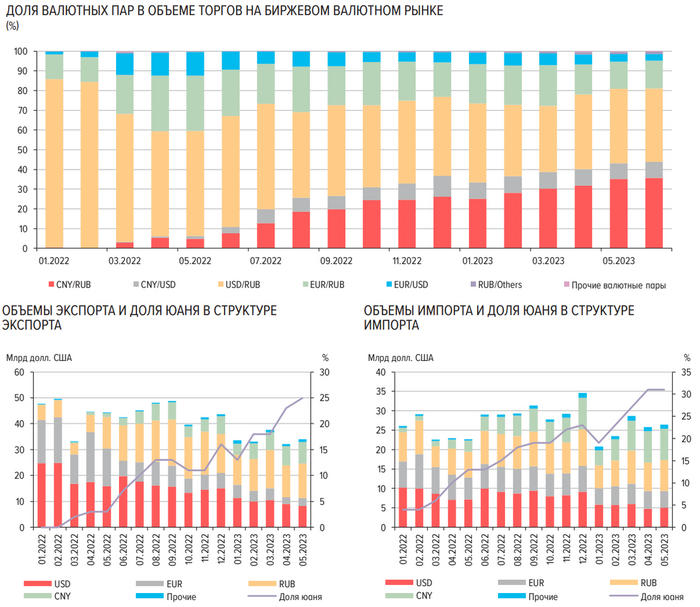 Наряду с повышением доли юаня продолжает возрастать также доля рубля во внешней торговле. В экспорте она достигла 39%, а в импорте превысила 30%. На этом фоне доля «токсичных» валют (доллара США и евро) в экспорте и импорте сократилась в мае 2023 г. до 32 и 34% соответственно.