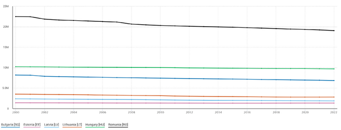 В Литве после 3 512 074 человек в 2000 оказалось 2 805 998 в 2022. В развитую страну приехало минус 20,1% юнитов.