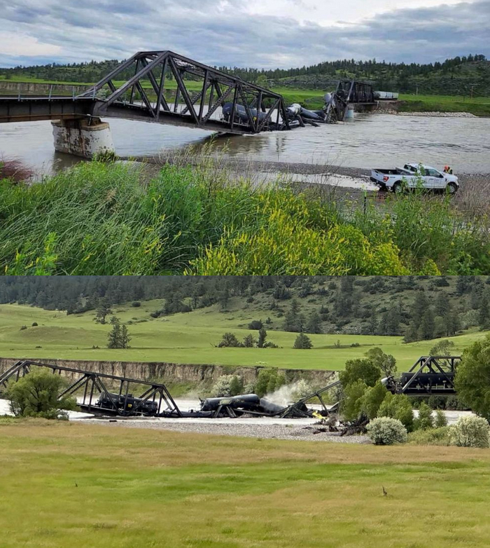 В субботу в 6:45 утра по местному времени вышел из чата мост через реку Йеллоустоун-Твин-Ривер вокруге Стиллуотер, штат Монтана. Сделал он это не один, а вместе с поездом. Поезд, естественно и традиционно, перевозил всякие потенциально опасные штучки. Так, в реку попали горячий асфальт и расплавленная сера. Пишут, что еще там был гидросульфат натрий, но он остался в цистернах.