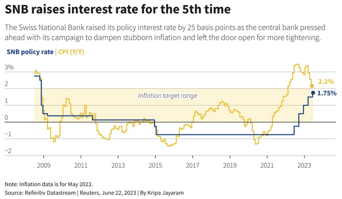 Национальный Банк Швейцарии продолжает цикл повышения ставок. Теперь она у них 1,75%. Это пятое подряд повышение. Вышли на уровень 2008 года.