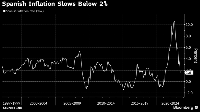 Рост цен в Испании замедлился до 1,6% годовых в июне, что ниже 2% - целевого уровня ЕЦБ.
