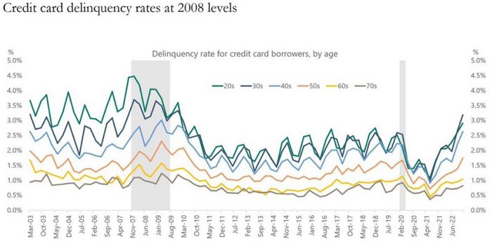 Пишут, что уровень просроченной задолженности по кредитным картам приближается к значениям 2008 года. Правда, не дали информации, какая конкретно просрочка (свыше 90 дней или другая, но обычно говорят про неё).