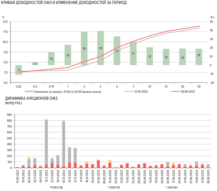 Возрастание проинфляционных факторов, ужесточение сигнала денежно-кредитной политики и продажи со стороны СЗКО (системно значимые кредитные организации) оказали влияние на динамику доходностей ОФЗ, в среднем по кривой они выросли на 20 базисных пунктов. При этом внутриполитические события второй половины июня серьезно не повлияли на доходности. Спрос на ОФЗ на первичном и вторичном рынках преимущественно предъявляли НФО (некредитные финансовые организации) за счет собственных средств и в рамках доверительного управления. В II квартале 2023 г. Минфину России удалось разместить 98,3% от планового объема размещения ОФЗ.