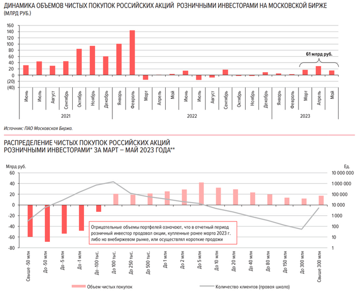 В июне 2023 года самыми популярными ценными бумагами в портфелях частных инвесторов были обыкновенные и привилегированные акции Сбербанка (30,6% и 7,9% соответственно), акции Газпрома (18,4%), ЛУКОЙЛа (11,4%), Норникеля (7%), привилегированные акции Сургутнефтегаза (5,9%), акции Яндекса (5,7%), Роснефти (5,4%), НОВАТЭКа (4%) и Магнита (3,8%).