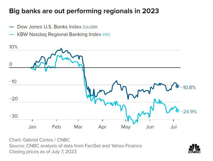 Но с начала года доходность их акций все равно отрицательная. Так, Dow Jones US Banks Index, отвечающий за весь банковский сектор, упал на -10,8%. В то же время индекс региональных банков Насдака ливнул на -24,9%.