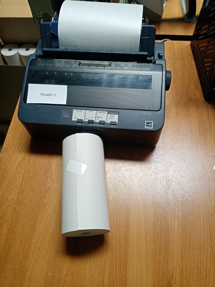 Вот такой вот раритет до сих пор трудится в одной из крупнейших компаний России. Матричный принтер Epson, заряжаемый рулонной бумагой. В кадр попала и коробка с запасными рулонами. Закупают снабженцы их с запасом.