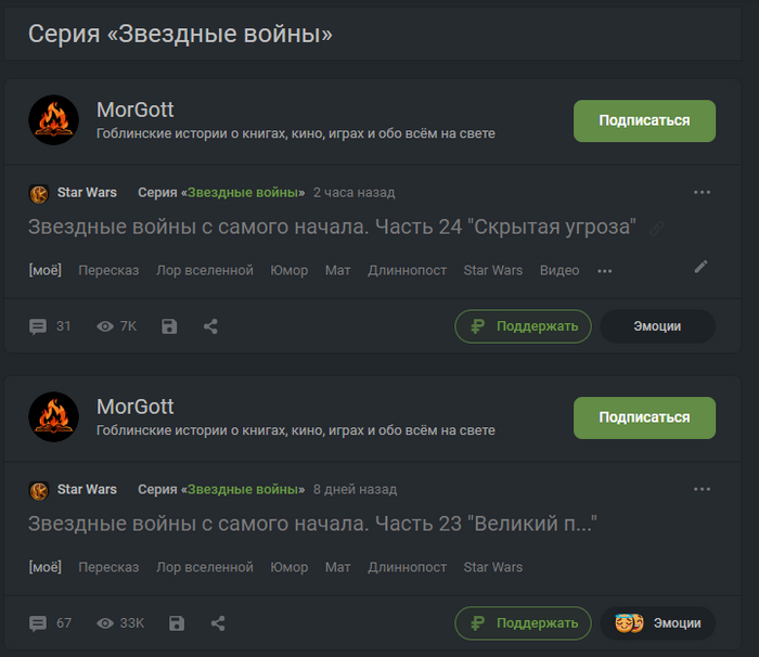Было бы классно, если бы была возможность подписываться на серию. Например, я бы хотел отслеживать только серию Звездные войны, а остальной контект автор мне не интересен.