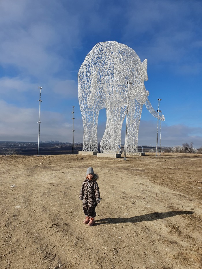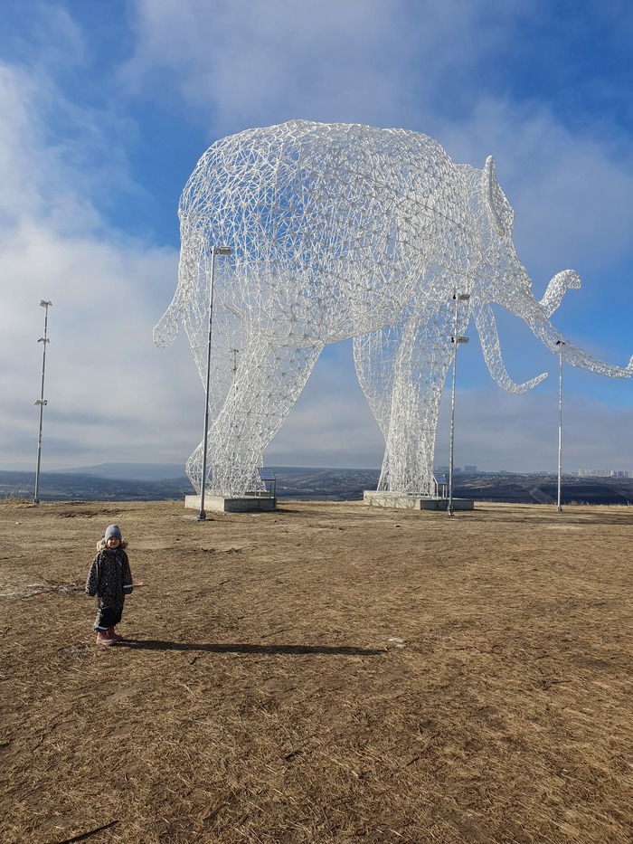 Недалеко от города был возведён этот арт-объект. Выбрал время и поехал с младшей доченькой посмотреть на мамонта. По нынешней погоде дорога не вызвала проблем для полноприводного автомобиля, но после дождя или снегопада думаю добраться до него будет хорошим приключением. Конструкция возведена на возвышенности, постоянно дует пронизывающий ветер, долго там находиться было невозможно. Сделал несколько фото и залез в машину греться.