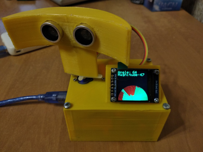 Из железа: Arduino UNO, серво двигатель, УЗ датчик hc-sr04, дисплей ST7789. УЗ датчик крепится к серводвигателю и получаем аналог антенны. Свой радар печатал на 3Д принтере.