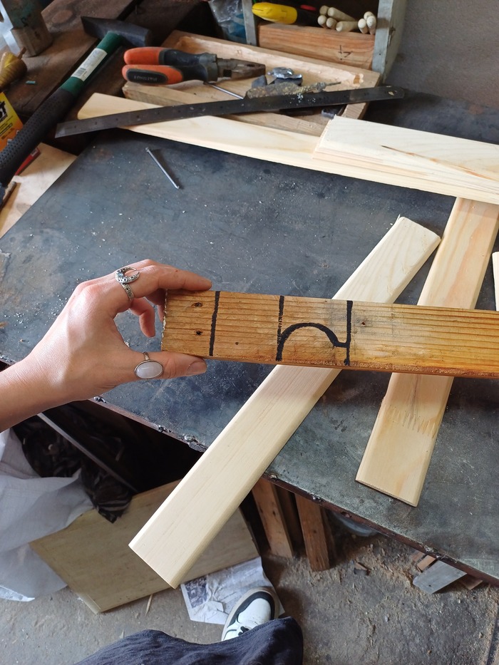 Размечаю отакую деталь на старой деревяшке от ящика. Их нужно две