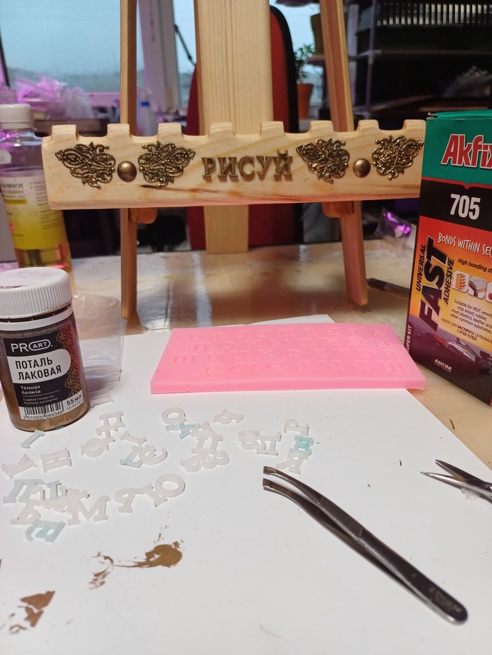 Буквы отлила из эпоксидки ещё какое-то время назад. А сейчас, вот, пригодились. Покрыла жидкой поталью заданного колера и... чпоньк.