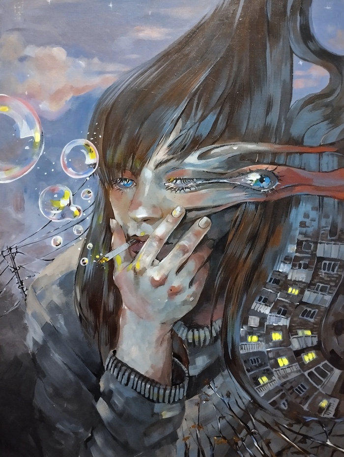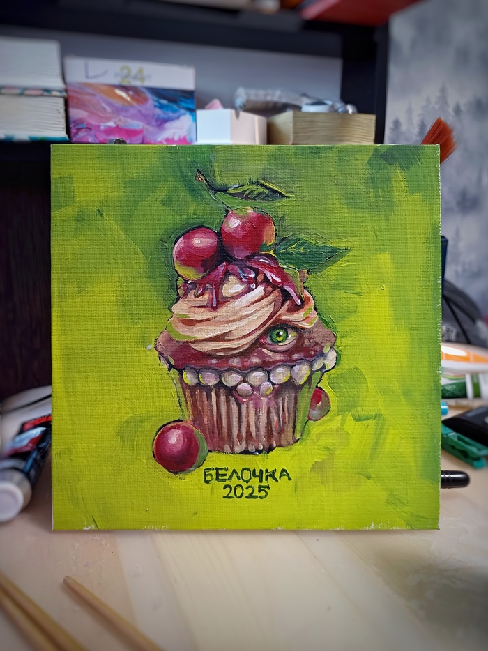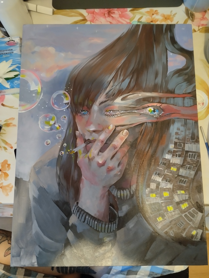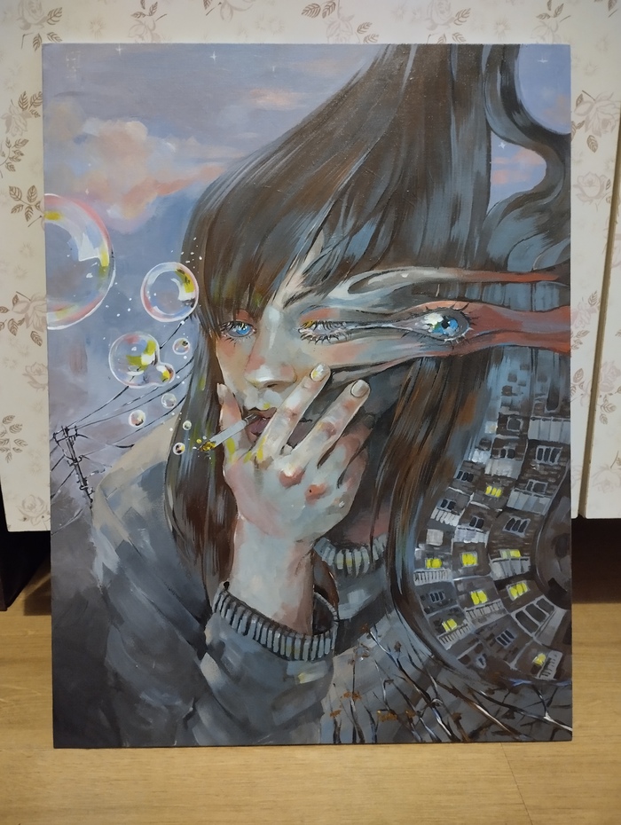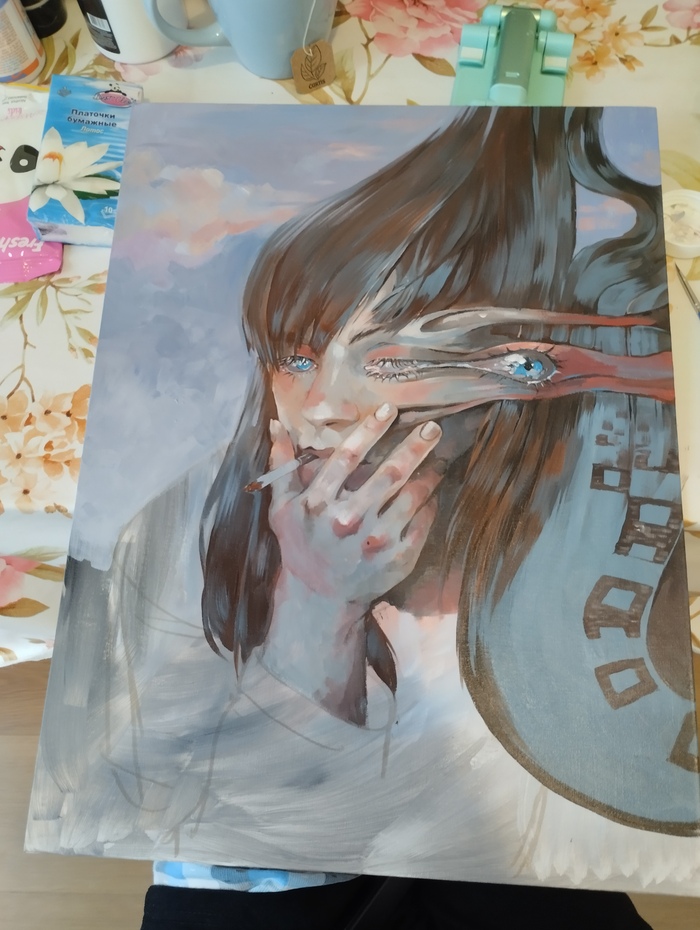 Я выставляла свои работы на неделе искусств от Евразийского союза художников. И там познакомилась с цифровым художником. Прикольный парень задарил мне футболку с принтом его авторства. А я не придумала ничего лучше и заказала на маркетплейсе небольшой набор красок и холстиков.
