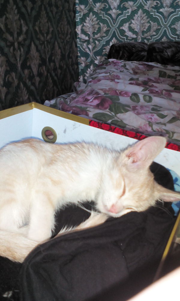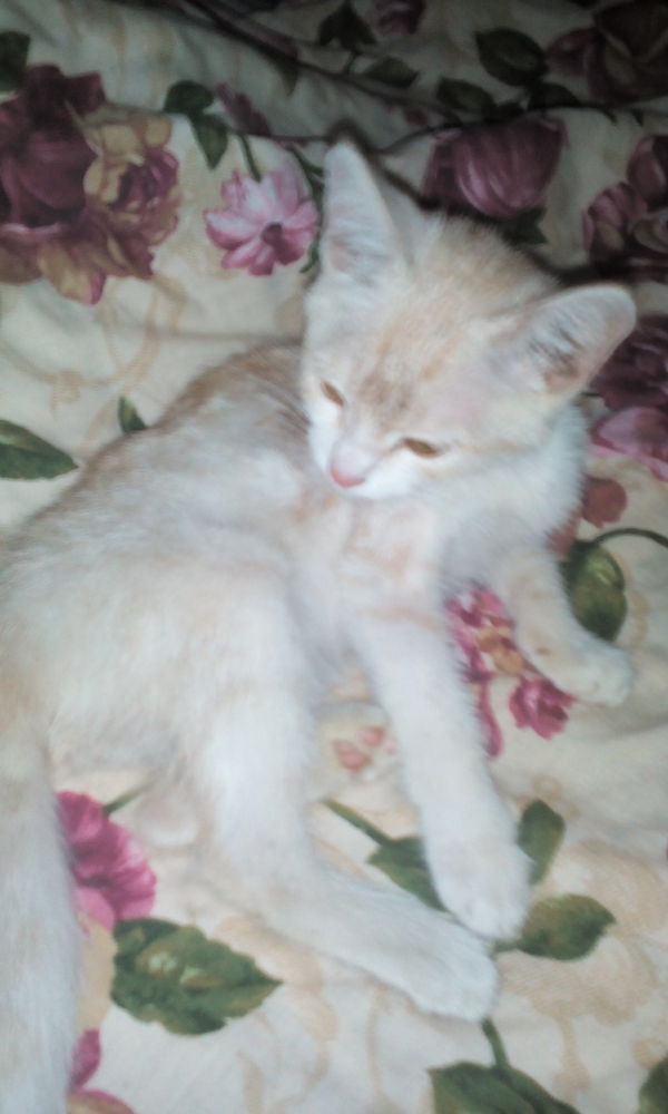Одним июльским вечером 2015 года приспичило мне сходить в магазин. Выйдя из подъезда, обратила внимание,что под кустом сирени что-то белеет. До сих пор не пойму,что заставило меня тогда обратить на это внимание. Подойдя поближе,увидела ,что под деревом лежит маленький грязный комочек. Человек я сентиментальный да и животных люблю, решила забрать животинку домой,помыть-проглистогонить его и пристроить в добрые руки.Пока я отлучилась ему за едой,котенок залез на диван и начал облизываться.