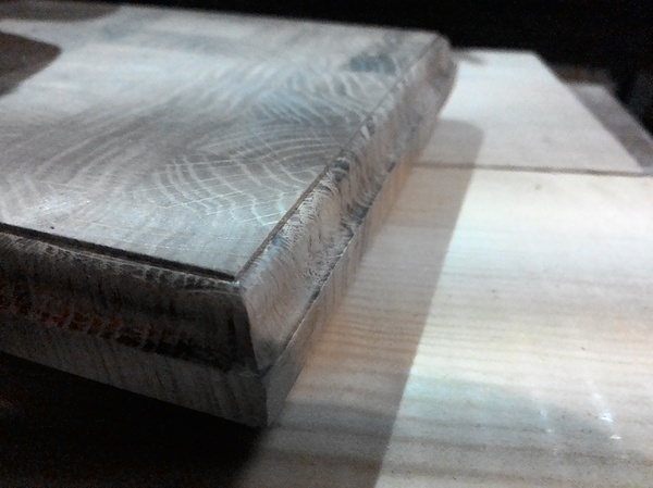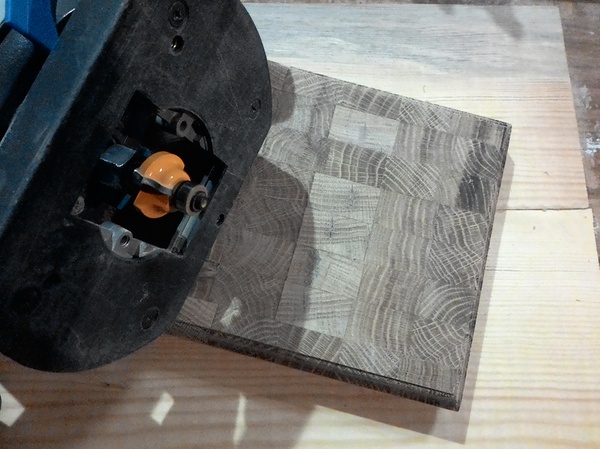 Переходим к столешнице и полке: склеил два щита, и с помощью фрезера придал им круглую форму, вырезал место под раковину в столешнице и паз для вклейки в бочку: