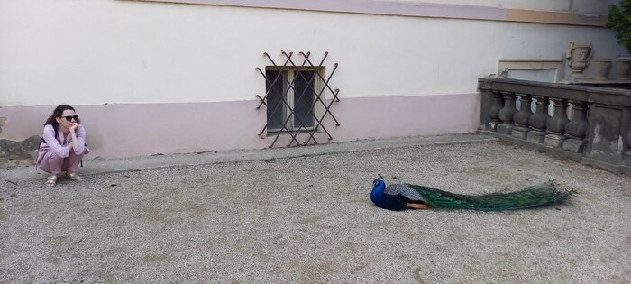 Вся эта история привела нас в парк, в котором находился общественный туалет. И оказалось, что это необычный парк - в нем свободно гуляют павлины, причем много - больше 10 точно. А между павлинами свободно ходят люди, и даже какие-то туристические группы заходили посмотреть. Я раньше не думала, что павлины летают, а тут обнаружила некоторых из них на ветках деревьев. Это было очень необычно, немаленькие такие птички сидят на деревьях.