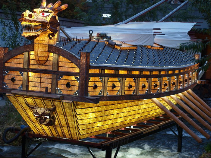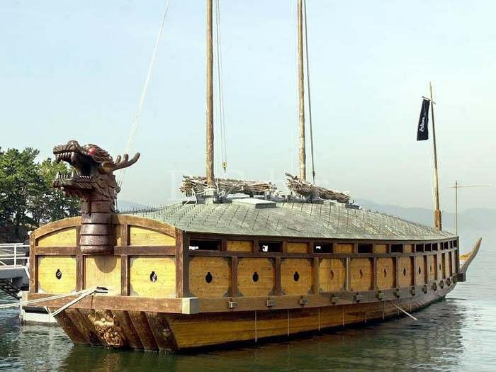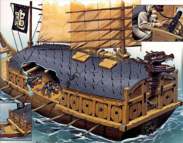 Теперь о роли брони, закрывавшей корабль сверху. Средневековой Корее приходилось время от времени воевать с Японией. При этом, если первая массово использовала корабельную артиллерию, нанося повреждения кораблям противника с расстояния, то вторая стремилась пойти на абордаж. Тут-то и выявлялось главное качество броневой крыши. Перед боем экипаж кобуксона убирал мачту под эту броневую палубу. Затем, после обстрела, когда какой-нибудь корабль противника все-таки добирался до «черепахи», шел на абордаж, его встречал неприятный сюрприз. Вся эта деревянная крыша корабля оказывалась усеяна металлическими шипами, которые были замаскированы соломенными пучками.