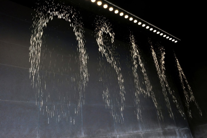 Архитекторы использовали современный подход при создании фонтана. Он всем своим видом показывает, что человечество шагнуло в цифровую эпоху. Мельчайшие водяные струйки выпускаются через точно высчитанные промежутки времени. Эти капли воды освещаются с помощью светодиодов. На специальном цифровом дисплее формируется любое изображение, которое затем проецируется на водяную «стену». Композиция постоянно меняется. Это могут быть электронные часы, передвигающиеся светящиеся узоры или надписи.