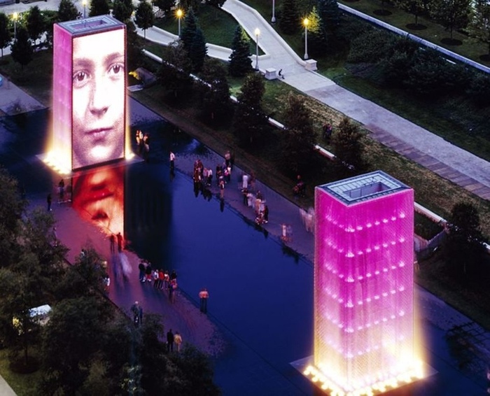 На фонтан «Краун», расположенный в чикагском парке «Миллениум», очень сложно не обратить внимание. Это мелкий бассейн с двумя прямоугольными 15-метровыми башнями, построенными из стекла и гранита.