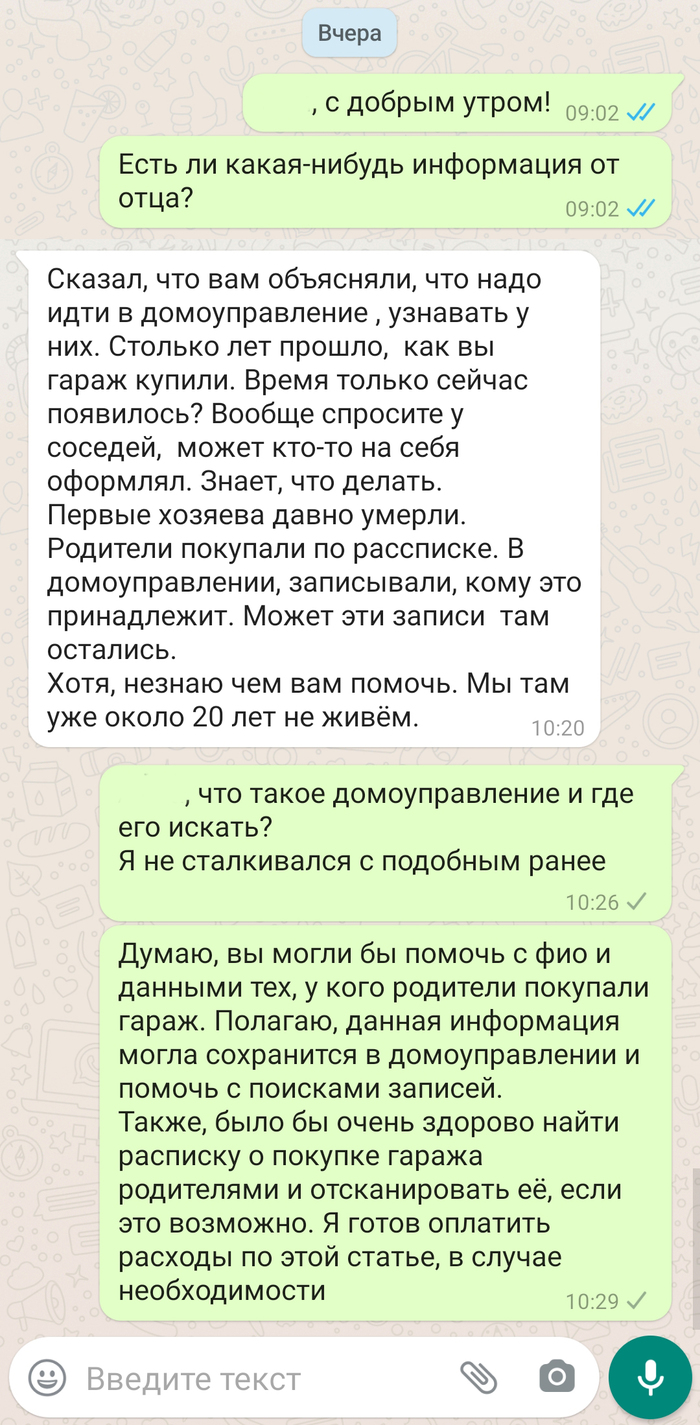 Отец тоже покупал этот гараж по расписке у кого-то, кого уже нет на этом свете. И вот ещё те хозяева, вроде как, оформляли этот гараж где-то там.