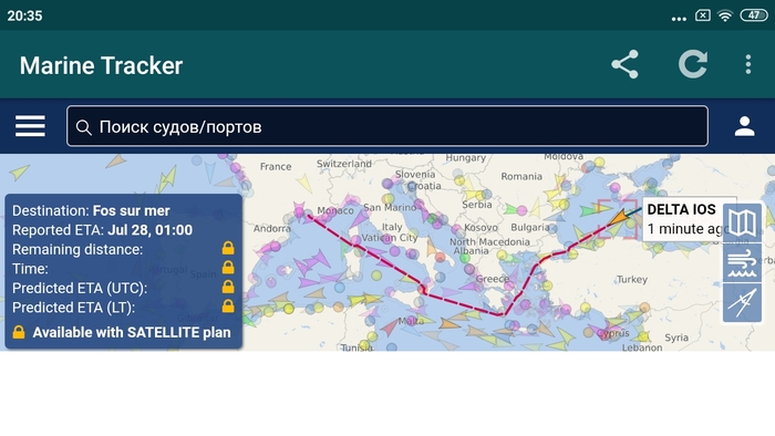 Поставил приложение на андройд которое отображает все гражданские суда и их маршрут, что бы посмотреть какие суда стоят в порту Одессы поскольку сегодня морское сообщение остановлено. В портах Украины их штук 30, но не в этом суть. Заодно посмотрел какие и куда идут танкеры с нефтью из Новороссийска, большинство из них заканчивают свой маршрут на Босфоре наверное потому, что стоят там в очереди, но некоторые маршруты видно до самого конца. И как пруф приложу пару скринов одного из них.