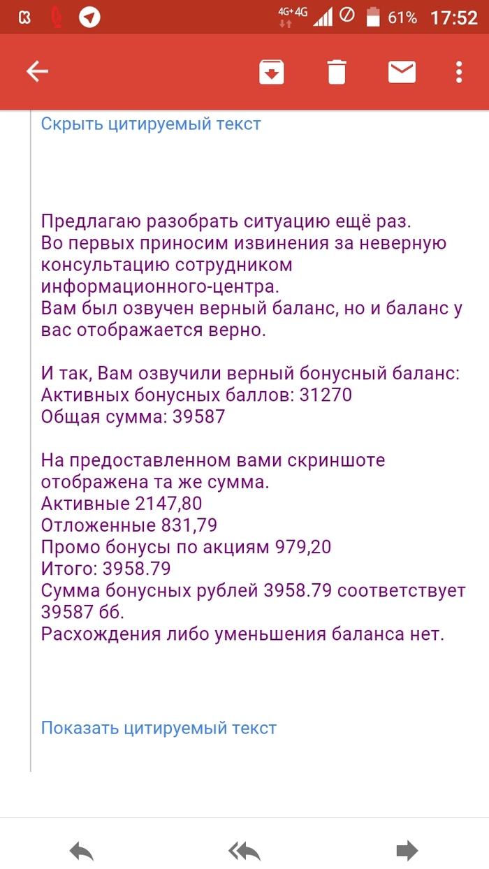 Тададиду а у нас если считать с "промо" (как оказалось это баллы, которыми можно оплатить только 20% от покупки, а ещё они сгорят 20.08) то все сходится. Ну и для тех кто в танке, смотрим на скрин и слушаем записи. Становится ясно, что промо баллы не входят в сумму активных или отложенных. В то время как операторы назвали правильную сумму без учёта промо (они считаются отдельно).
