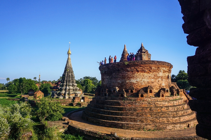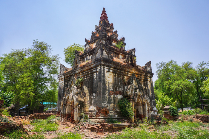 На крышу залазибельный, небольшой храм Мьинт Мо Таунг, один из выживших в результате большого землетрясения 1839 года в Инве, столице бирманского королевства Ава. Конусообразная "пироженка" на заднем плане - ступа Лока Дота Манаунг.