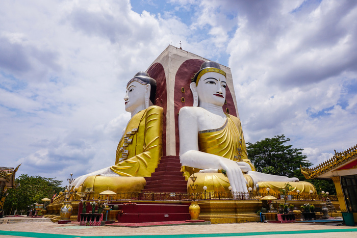 Необычный монский храм Чьяйик Пун Пайя в Баго. К прямоугольному параллепипеду центральной ступы прислонились спинами гигантские статуи трех Будд прошлого - Конагаманы, Какусанды, Кассапы и исторического, Гаутамы. Храм старинный, регулярно реставрируется.