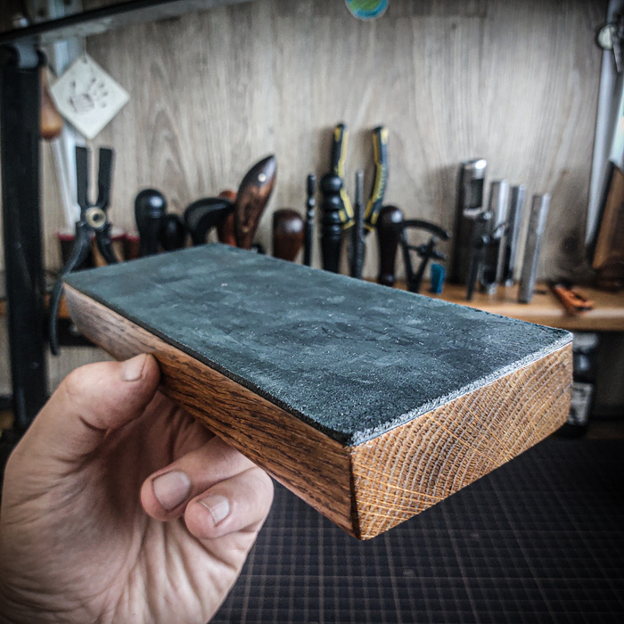 Правлю на доске с кожей, на которой нанесена паста ГОИ. Доску делал сам, пасту покупал в строительном магазине