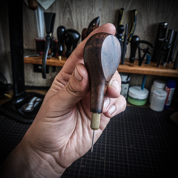 Их у меня 3. Основное ( для разметки) сделал сам из напильника. И два покупных со сменними жалами. Их использую для докола отверстий под шов