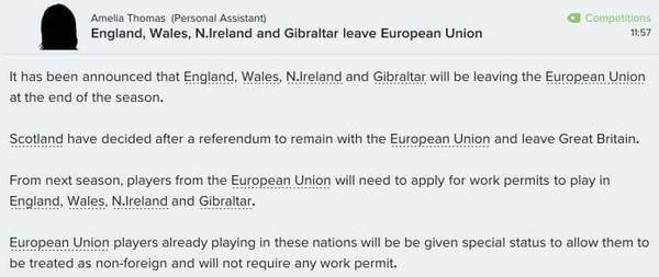 Майлс Якобсон - директор Sports Interactive в интервью The Telegraph рассказал, что в новом Football Manager 2017 будет реальная симуляция Брекзита.