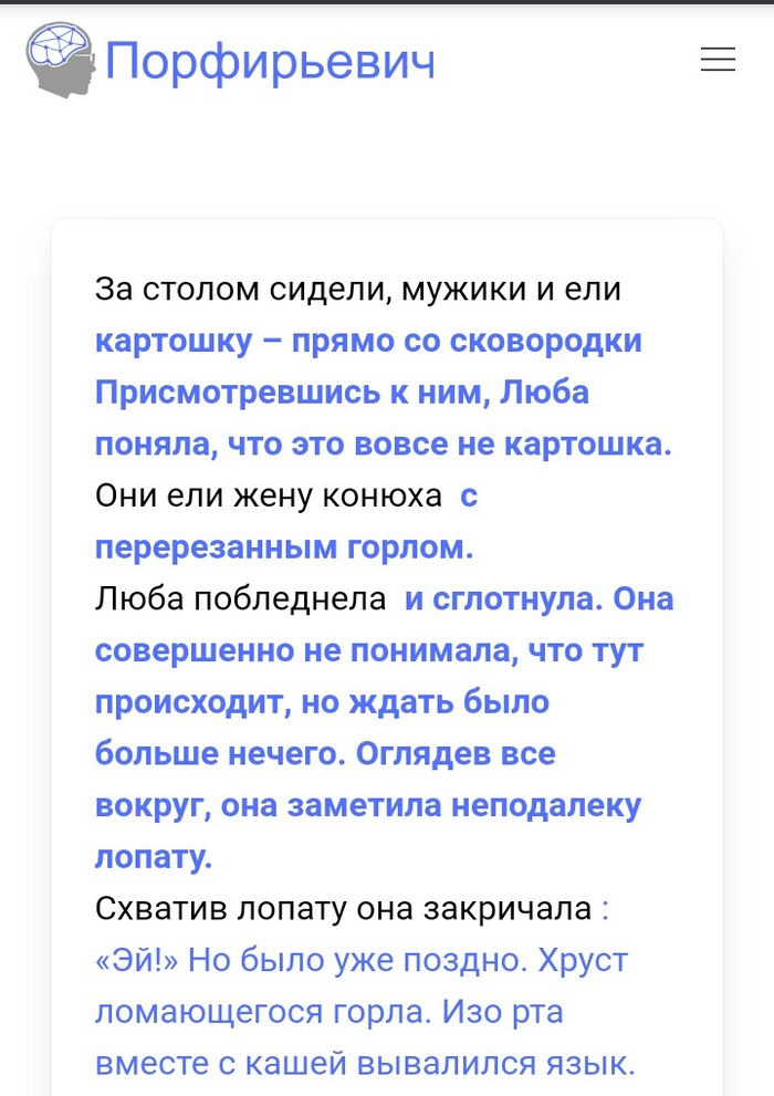 15 BigLebowsky 4 года назад Ели мясо мужики. Версия нейросети Наткнулся на интересную нейросеть, которая помогает писать истории. Предложил ей сюжет известной песни, вот что получилось. Чёрный шрифт мой текст, синий нейросеть. Показать полностью 3 [моё] Король и Шут Нейросеть Порфирьевич Ели мясо мужики Длиннопост Ещё 0
