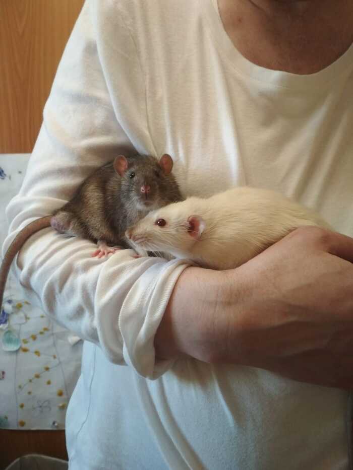 когда брал , в компании (они жили вместе) с ними был крыс 5 месяца. Мелких положил в свою переноску, тот крыс вылез из своей клетки , стал ползать по переноске. Видно было , что хотел быть с ними ( или мне так хотелось думать :-)).