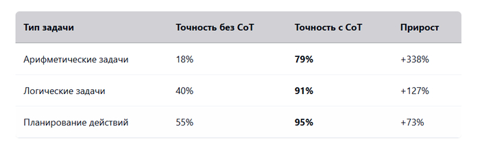Они доказали, что CoT-подход радикально повышает точность в задачах, требующих логики и здравого смысла: