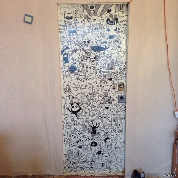 10 Bigland 10 лет назад Оформил дверь в общежитии Много не моего (стырено с просторов интернета), но рисовал сам, часов 8-10 в сумме потратил на всё это. Выключатель специально так висит, да) [моё] Дудл Дудлы Оформление Общежитие Дверь Рисунок Маркер