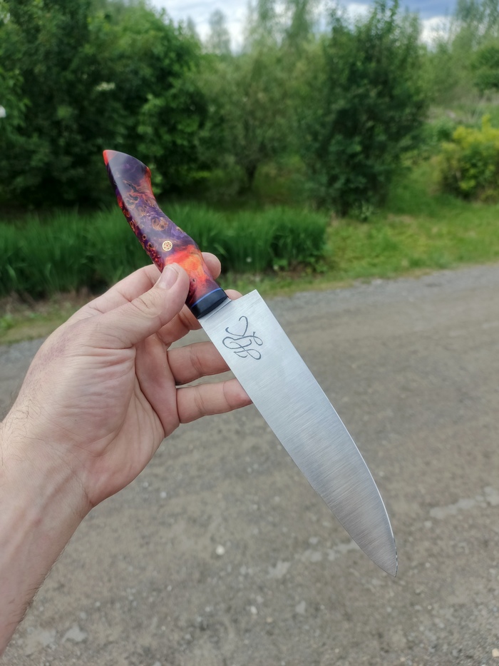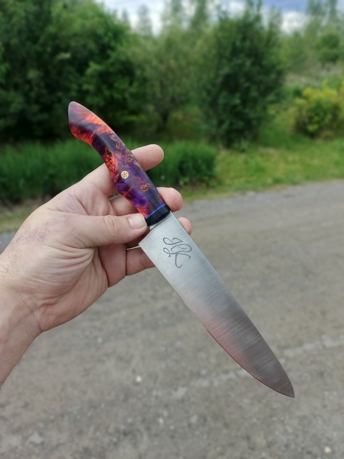 Ну, надо, так надо. Клинок из N690 и брусок для рукояти заказал в Ясном соколе, мозаичные пины у Димани в ВК. Качество отменное. Фото не передаёт красоты. Диаметр 6 и 8 мм.