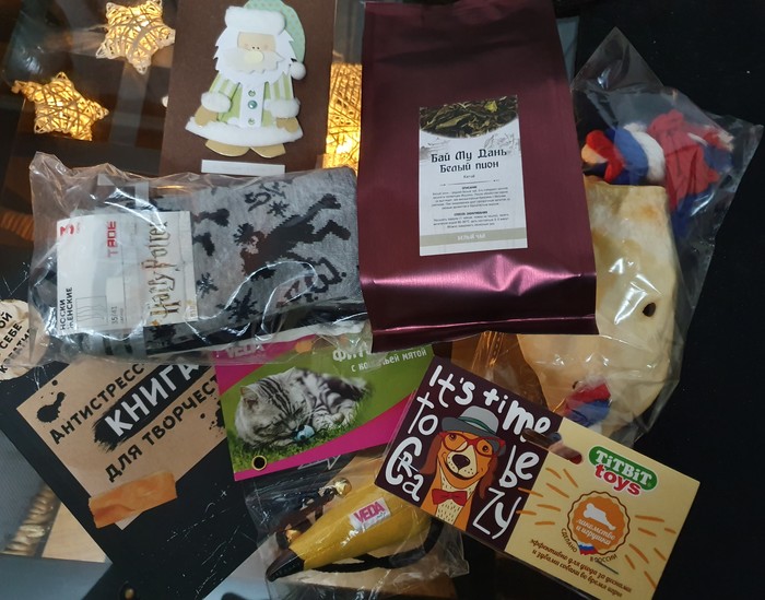 Здесь очень много всяких крутых ништячков, которые не только совпали с моими пожеланиями, но и помогут пережить трудные времена. Книга, вкусняшки (как я люблю!! Суп сразу заварила, очень вкусный!), чай (пахнет бомбезно), маска с персональной вышивкой для фаната ГП, набор для рукоделия, интерактивная туалетная бумага, коллекционные открытки (это неожиданно и очень круто!), очень красивые тарелочки для аперитива или соусов (очень красивые!!!), компас (а вдруг пригодится), и подарочки моим пушистикам (бублики чихуашику, игрушка... тоже ему, он жадненький). Всё было заботливо упаковано и подписано.