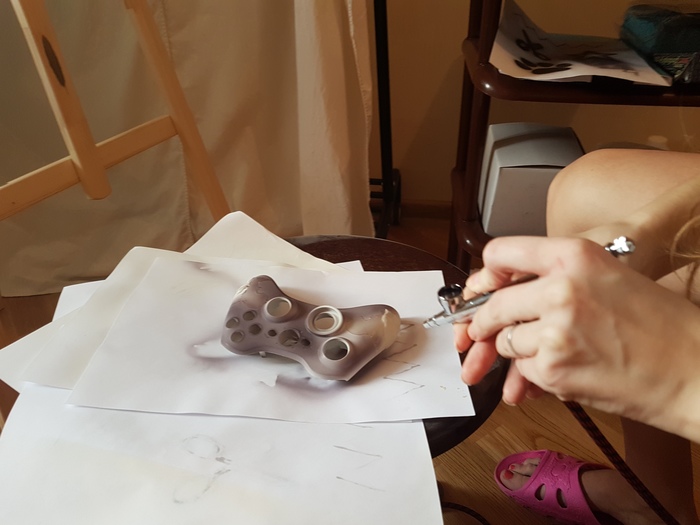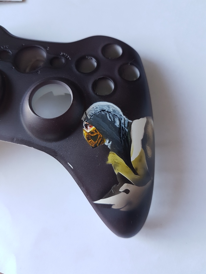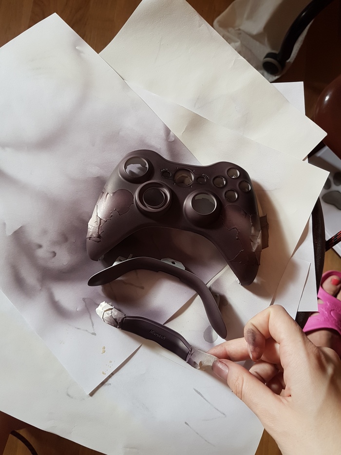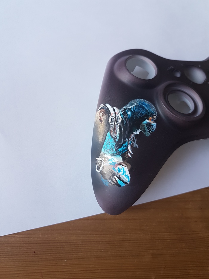 Хочу поделиться с вами работой моей подруги, которая не так давно занялась аэрографией. Решили они с мужем дать новую жизнь старенькому контроллеру от Х-BOXa. По моему скромному мнению результат отличный. Надеюсь будет интересно.