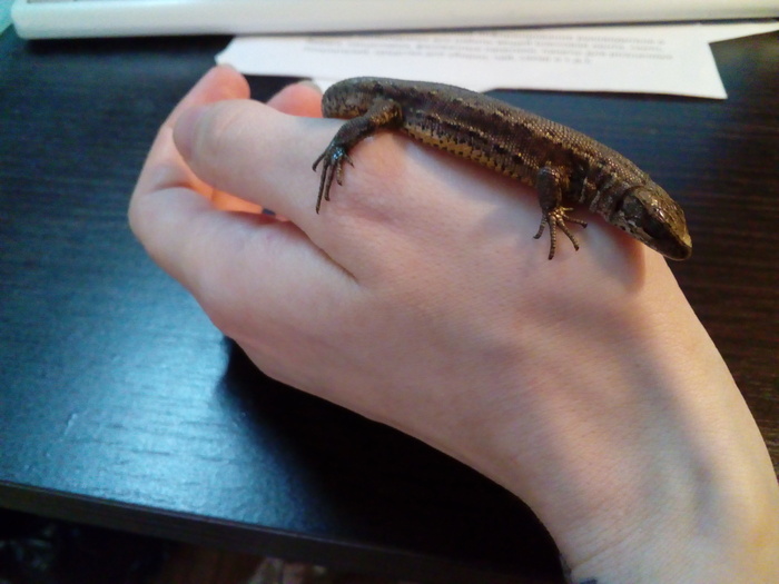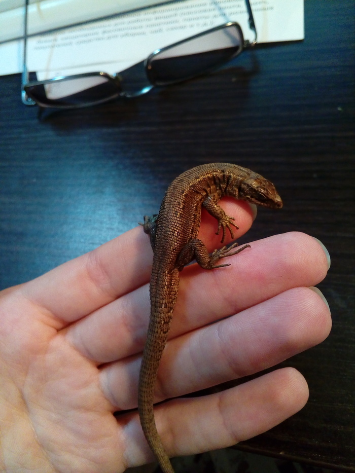 Дома в коробке оказались не только дырочки, но и опилки. А в опилках - жёсткий оливково-желто-красный кнут. Выуженный "кнут" чихнул и посмотрел на меня янтарными глазами, облизнувшись розово-черным языком.