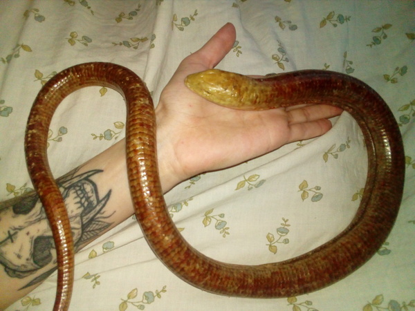 Это оказался взрослый, длинный и крепкий желтопузик, самец. Жуткий флегматик. Выглядел он так, словно каждый день путешествует.