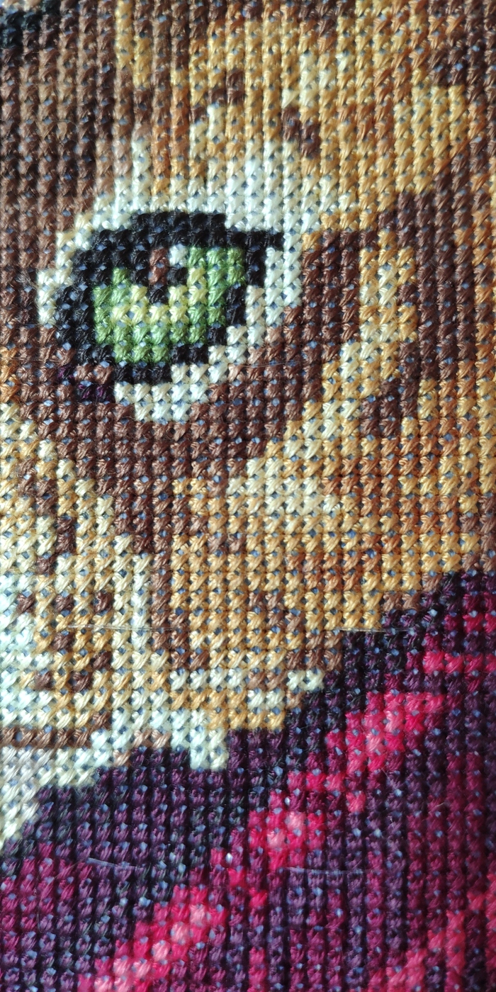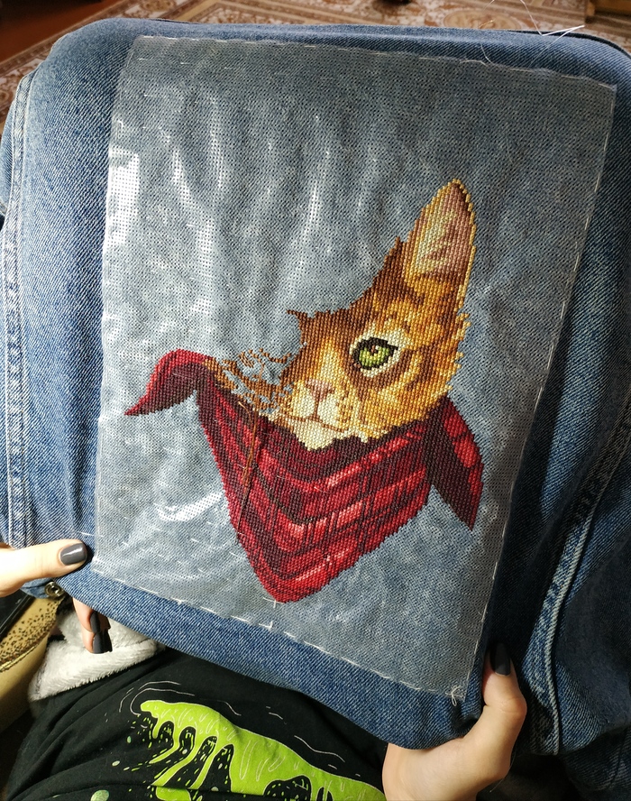 Кот вышивался в буквальном смысле на коленке. Главное удобное кресло и хороший свет.