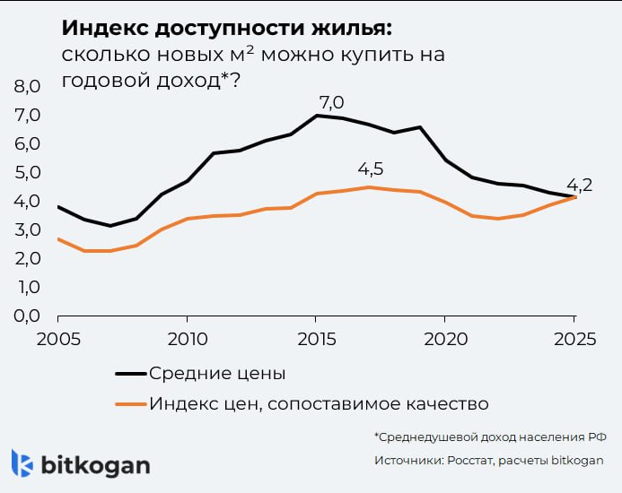Если же эти эффекты устранить, и посчитать индекс доступности жилья на основе изменения цен сопоставимого качества, то ничего особо не изменилось за 10 лет. Сегодня можно на годовой доход купить 4,2 кв. м, а в 2015 – 4,5 кв. м аналогичного качества.