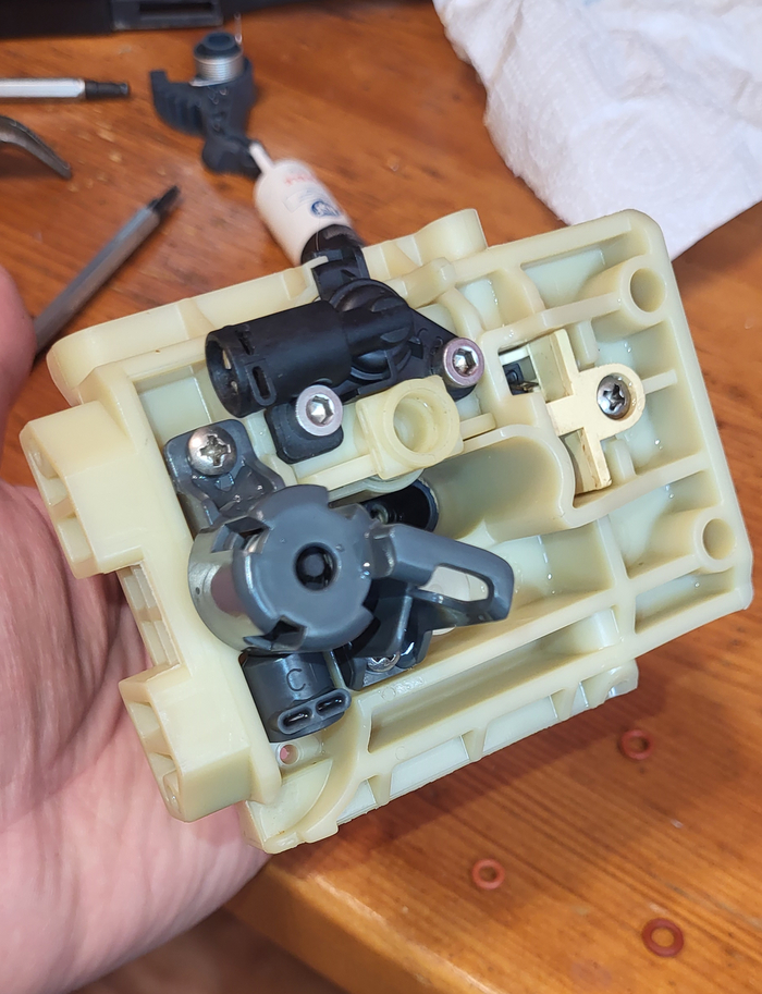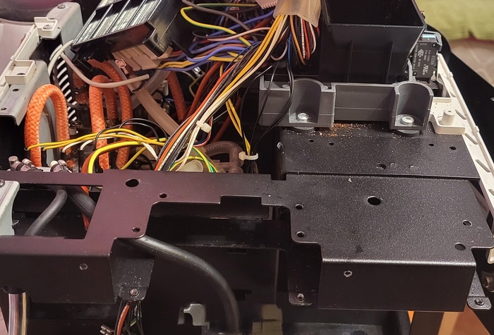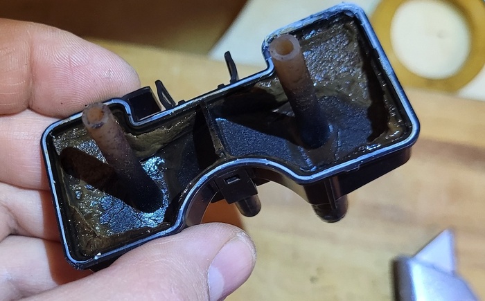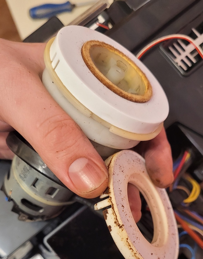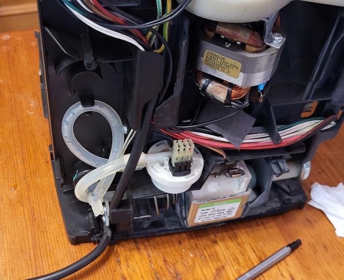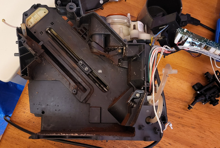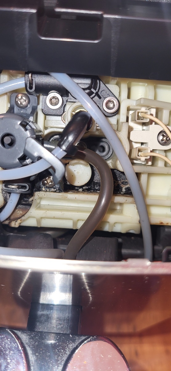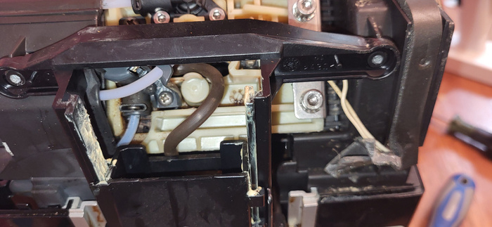 Заварник я тоже уже перебрал, заодно почистил диспенсер. Теперь все собираем. После декальцинации (требование которой все время горело на дисплее) я обнаружил, что отвалилась помпа. То есть декальцинацию она прошла, но потом умерла). Пришлось еще и помпу поменять.