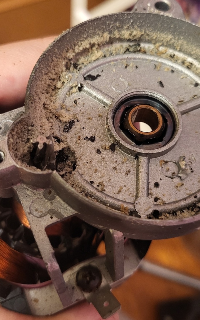 Разбираем. В кофемолку попал инородный предмет. Само собой движок от перфоратора не пострадал, а вот шестеренчатая передача пострадала.