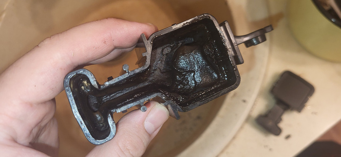 Далее черед кузова (профессионально это называется шасси). Снимаем все лишнее, будем все отмывать. Видим внутри, что все очень грязное. Меняю лапку, чищу половинку (благо ее можно помыть под краном, тут ничего кроме лапок нет). Чищу шланги и флоуметр от ржавчины. Кстати, бак я тоже замочил и ржавчину удалил.