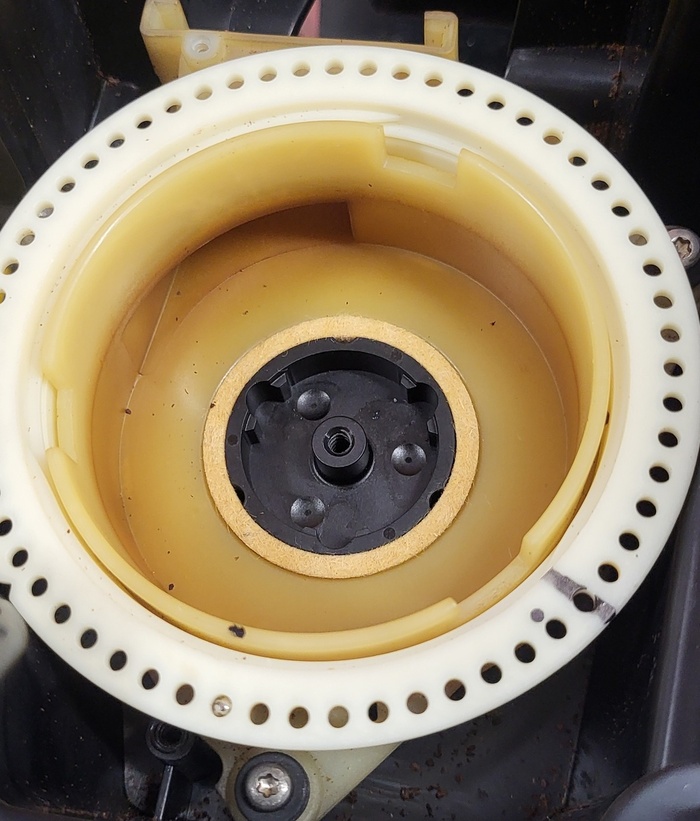Вторая проблема – держатель верхнего жернова. Он никак не уплотняет отсек с жерновами и кофейная пыль через него наверх попадает в отсек кофемолки. Оттуда равномерно распределяется по машинке, в том числе и на двигатель кофемолки. Что не очень хорошо для мотора, естественно. Пыль может также просачиваться между белой крышкой и отсеком для жерновов.