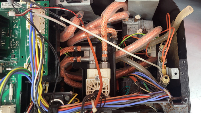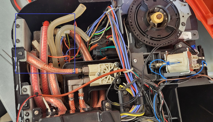 Внутри машинки насчитываем пять точек протечки, считаем. Два – шланги на бойлере, один – дренажный клапан, один – клапан в гребенке и один – шланг на штуцер заварного устройства.