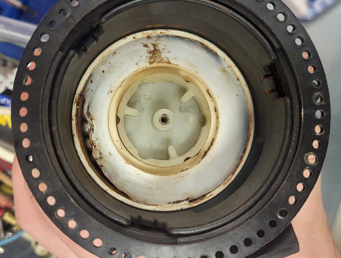 И опять таки - работало же! Подтекала, но работала. Поршень надо будет перебрать, недостающие винты поставить. Развалился также и отвод воды из стакана в дренаж. Но это мелочи, они при таком пробеге всегда плохо себя чувствуют. В общем перебираем поршень, ставим новые уплотнители. Заодно отмываем его внутри от ржавчины