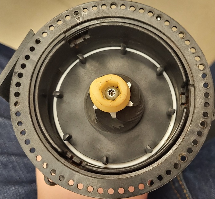 В ней установлена мини крыльчатка, а кофевод стал очень узким. С держателя верхнего жернова пропал уплотнитель, теперь уплотнитель — это фторопластовое кольцо надевающееся непосредственно на верхний жернов в проточку. Из нюансов - оно иногда пропускает кофейную пыль. Да и мини-крыльчатка не без проблем - она изнашивается (казалось бы нам мало было стачиваемых жерновов).