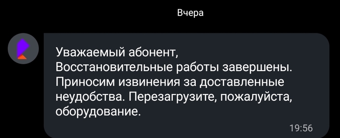 Ок, переподключаю PPTP на роутере, IP меняется, но интернет отваливается. На всякий случай перезагружаю роутер полностью. Результат предсказуем - интернета хер. Зато IP теперь статический, ага. Снова пишу в чат - валят всё на массовые работы, которые будут закончены к 01:16. Вот жеж совпадение какое! Стартанули работы пока я роутер перезагружал. Получаю радостное сообщение от РТ в Viber