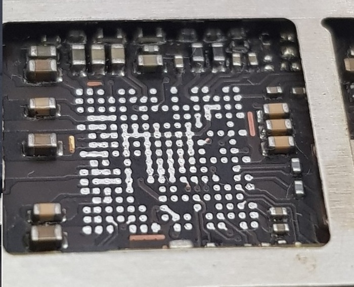 Оплеткой и паяльником чистим посадочное место от старого припоя. Фото крупнее после очистки от припоя и флюса.